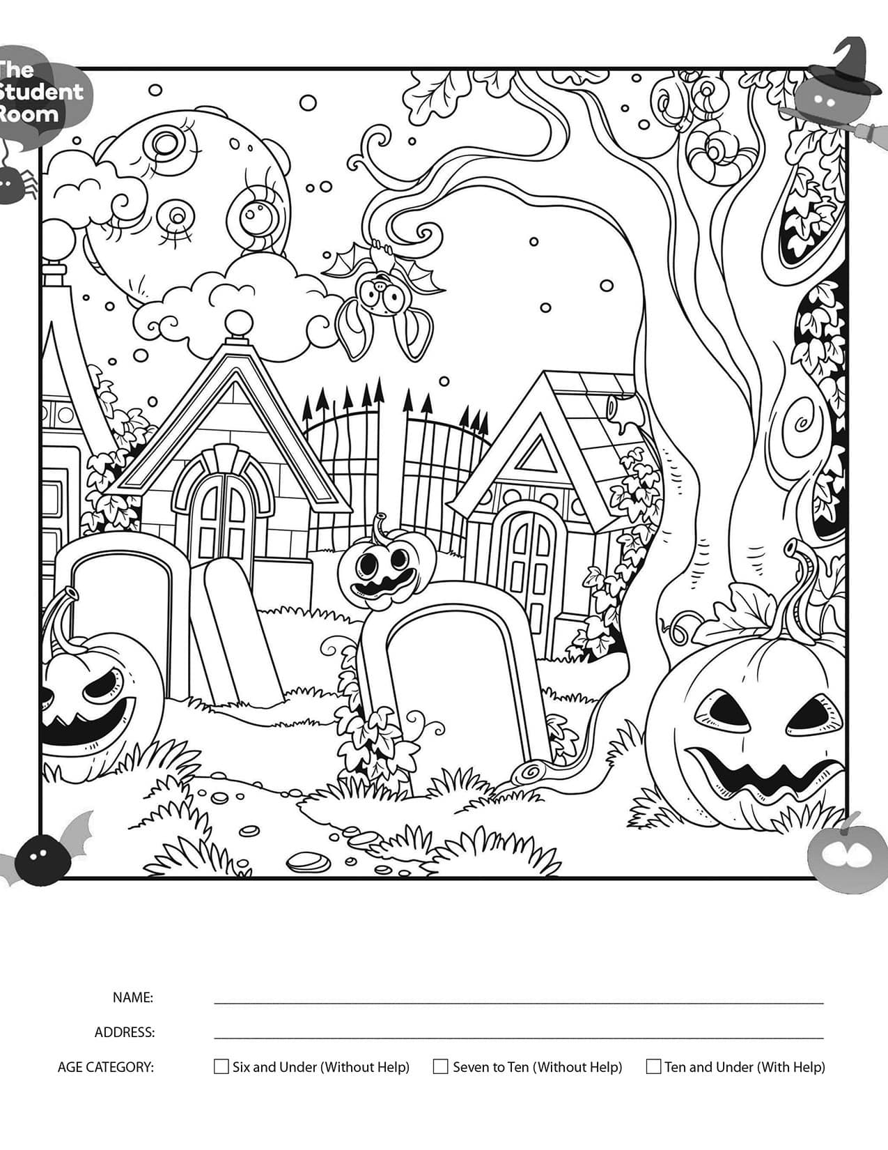 Entries must be colored by hand (no digital enhancement). $25 will be awarded to the spookiest and most creative entries in the following three categories: Six and Under (Without Help), Seven to Ten (Without Help), and Ten and Under (With Help). See below for the image we have selected for the 2021 Coloring Contest.